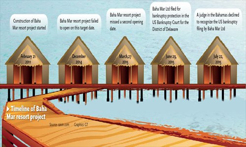 Baha Mar, a resort and casino project valued at more than $3.5 billion, is being built by China State Construction Engineering Corp (CSCEC) under contract with developers led by local businessman Sarkis Izmirlian, who filed for bankruptcy protection in the US on June 29, blaming "repeated delays" of the project by the Chinese side.