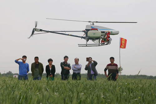 A drone is spraying crops with fertilizer. (Photo/China Daily)