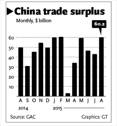 The GAC data also showed that in the first eight months of this year, China's foreign trade stood at 15.67 trillion yuan, down 7.7 percent compared with the same period in 2014, with exports and imports during the same period down by 1.6 percent and 14.6 percent, respectively.