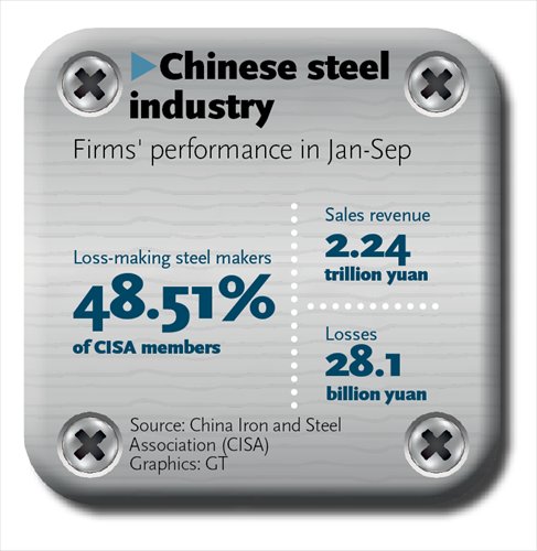Chinese steel makers also face difficulties in fundraising even though the country has cut benchmark interest rates and banks' reserve requirement ratio several times this year, the CISA said, noting that the amount of money steel makers borrowed from banks dropped 2.02 percent year-on-year in the first nine months.