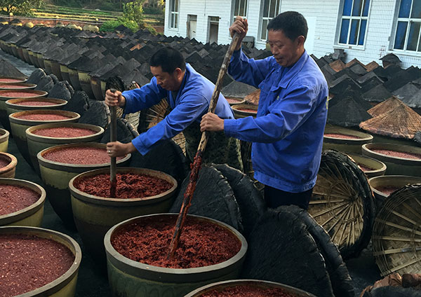 Workers process hot pepper sauce at Yiliuxiang Food Co in Shizhu county, Chongqing. The company is one of the beneficiaries of the poverty relief financial programs. (Photo: China Daily/Tan Yingzi)