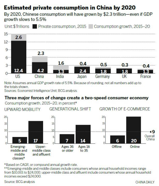 China is projected to remain one of the world's fastest-growing consumer markets by 2020, reaching $6.5 trillion in annual private consumption even if annual GDP growth slows to 5.5 percent over the next five years, according to a study by Boston Consulting Group and AliResearch, the research arm of Alibaba Group Holding.