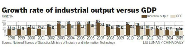 The annual expansion rate for industrial output will be around 6 percent this year, well below this year's GDP growth, which is likely to be about 7 percent, the Ministry of Industry and Information Technology said, adding that such a situation was happening for the first time in nearly two decades.
