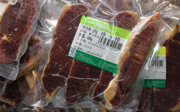 Packaged frozen beef steak products at a supermarket in Nantong, Jiangsu province.(Photo/China Daily)