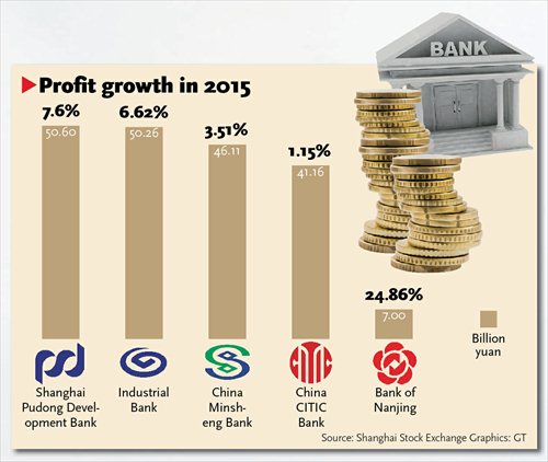 Among listed banks that have released full-year results, Shanghai Pudong Development Bank (SPDB) said profits rose 7.6 percent year-on-year in 2015, down from 14.92 percent in 2014.