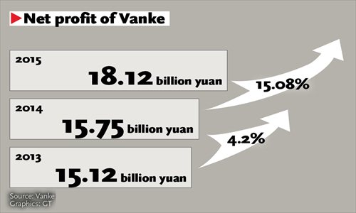 On Sunday, Vanke reported a 15 percent increase in full-year profit for 2015, reflecting the government's move to ease property curbs and prop up housing demand.