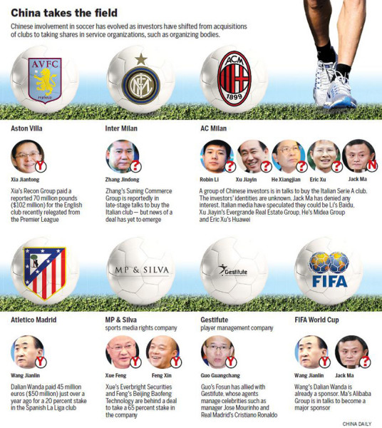 He has seen a change of emphasis in Chinese investment since the start of this year, from the straightforward acquisition of clubs, or stakes in clubs, to investing in soccer service organizations, such as sports agents and organizing bodies such as FIFA.