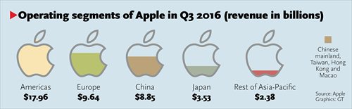 Business in Chinese mainland, Taiwan, Hong Kong and Macao fared worst, with revenue down 33 percent to $8.85 billion. The Americas, with $17.96 billion of revenue, remained Apple's biggest operating segment.