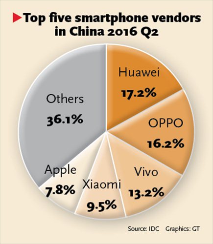 The top domestic smartphone vendors, Huawei, OPPO and Vivo, had 46.6 percent of China's smartphone market in the second quarter of 2016, which reflects their brand-building efforts and aggressive marketing strategies, International Data Corp (IDC) said in a report released in August.