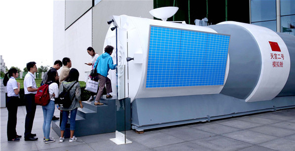 People line up to examine a replica of the Tiangong-2 space laboratory at the China Science and Technology Museum in Beijing on Sunday.(CHEN XIAOGEN/CHINA DAILY)
