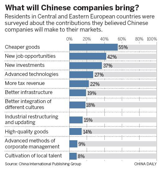 According to the survey, 55 percent of interviewees believe that Chinese companies are able to bring quality and bargain products to their markets, and 42 percent think Chinese businesses will help create jobs.