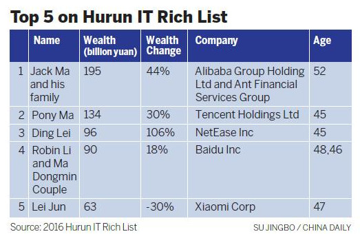 Jack Ma and his family's total wealth in IT industry was 195 billion yuan, followed by Pony Ma, whose wealth increased by 30 percent year-on-year to 134 billion yuan, according to the Shanghai-based Hurun Research Institute.