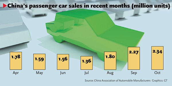 The main force in the sales surge in October was small-engine cars, Ye Shengji, deputy secretary general of the CAAM, told the Global Times on Thursday.