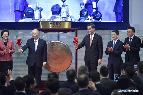 Leung Chun-ying (5th R), chief executive of Hong Kong Special Administrative Region, and Hong Kong Exchanges and Clearing Chairman Chow Chung-kong (4th L) jointly beat the gong to mark the launch of the Shenzhen-Hong Kong Stock Connect, the second link between the inland and Hong Kong bourses, in Hong Kong, south China, Dec. 5, 2016. (Photo: Xinhua/Wang Shen)