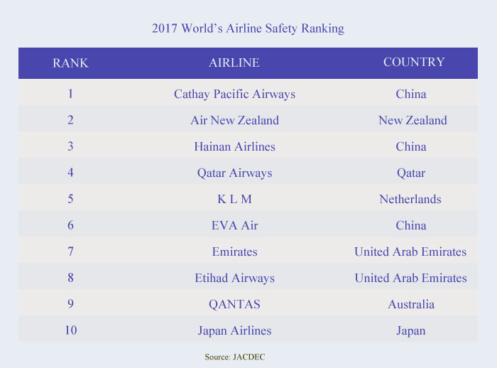Three Chinese airlines rank among the top 10 of 2017 World's Airline Safety Ranking published by the Jet Airliner Crash Data Evaluation Centre, which is based on safety performance in 2016.