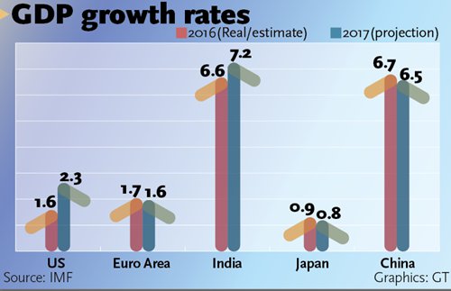 In the latest update of the IMF's world economic outlook, published on January 16, China's GDP is forecast to grow at 6.5 percent in 2017 and 6.0 percent in 2018. Meanwhile, the US growth predictions are set at 2.3 percent for 2017 and 2.5 percent for 2018.