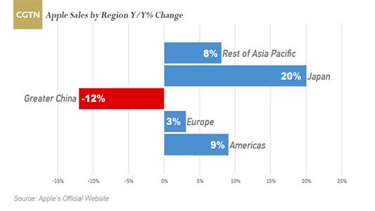 The revenue in Greater China, which includes the Chinese mainland, Hong Kong, Taiwan, and Macao, stood at 16.2 billion U.S. dollars in the quarter, down 12 percent. It marked the fourth straight fall in quarterly revenue in the market.