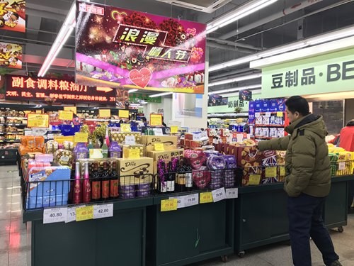 A shopping mall located in Beijing's Chaoyang district launched their Valentine's-themed promotions two days early, according to a salesperson surnamed Xu.