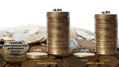 In the first half of 2017, centrally administered SOEs posted revenue of 12.5 trillion yuan ($1.8 trillion), an increase of 16.8 percent year-on-year, Shen said, noting 48 of them reported more than 10 percent growth rate in net profit.