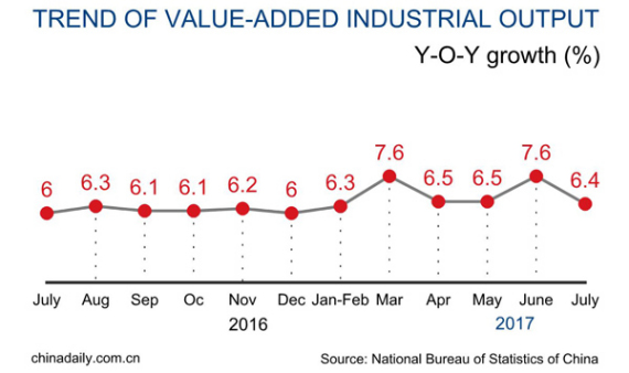 Value-added industrial output, an important economic indicator, grew 6.4 percent year on year in July, down from the 7.6-percent increase for June but up from the 6-percent rise for the same month of last year, according to data from the National Bureau of Statistics (NBS).