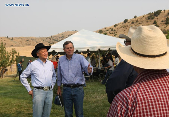 Steve Daines (2nd L), a senator from U.S. state of Montana, and Cui Tiankai (1st L), Chinese Ambassador to the United State, speaks with Fred Wacker and other cattle ranchers at the Morgan Ranch House, near downtown Bozeman, Montana, the United States, on Sept. 8, 2017. (Xinhua/Yan Liang)