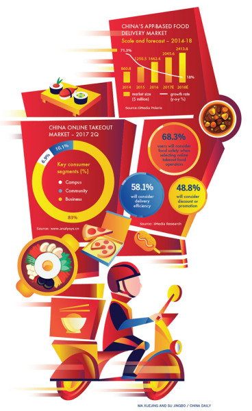 According to market information firm Analysys' China Internet Catering Market Report 2017, the April-June quarter has seen the food delivery segment notch up sales of almost 46 billion yuan, up 28 percent sequentially and up 82 percent year-on-year.