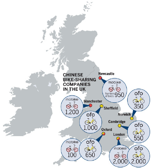 The bike-sharing company has about 4,500 bikes on British roads-around the same as Mobike, which operates in Manchester, Newcastle, Oxford and London.