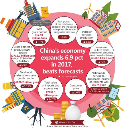 China's economy expanded 6.9 percent in 2017, picking up pace for the first time in seven years.