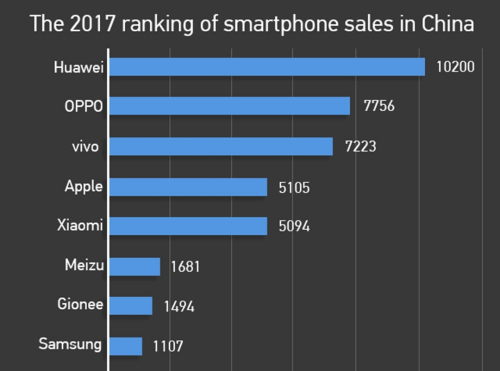 On the contrary, home-made mobile phones have become increasingly strong in the market due to their good performance and relatively low prices. In 2017, Chinese brands dominated the domestic market, according to data released by the international investigation agency GFK.