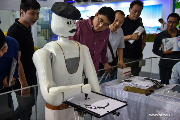 People watch a robot painting demonstration during the 19th China Hi-tech Fair in Shenzhen, south China's Guangdong Province, Nov. 16, 2017. Over 3,000 exhibitors participated in the hi-tech fair displaying a lot of robot and artificial intelligence projects. (Xinhua/Mao Siqian)