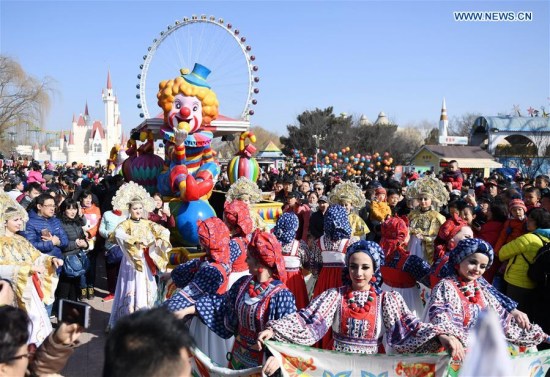 Visitors attend a temple fair held in the Shijingshan amusement park in Beijing, capital of China, Feb. 21, 2018. With snacks and performances, the temple fair was held to celebrate the Spring Festival holiday. (Xinhua/Zhang Chenlin)