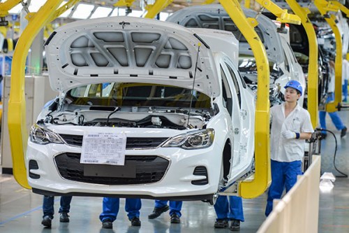 Technicians work on a car production line of a General Motors venture in Wuhan, capital of Hubei Province. (Photo provided to China Daily)