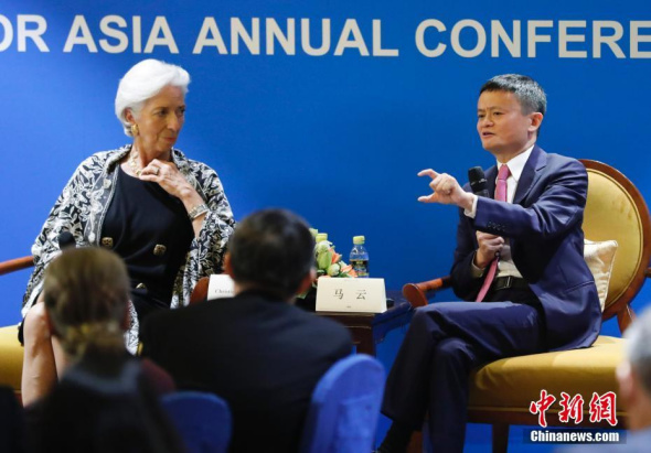 IMF Managing Director Christine Lagarde (L), and Jack Ma, founder and chairman of Alibaba Group, talk on the sidelines of the Boao Forum for Asia Annual Conference 2018 on April 9, 2018. (Photo/China News Service)