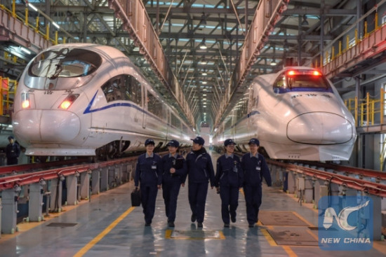 Members of the high-speed train maintenance staff at Hefei South Railway Station, are pictured at a service depot in Hefei, capital of east China's Anhui Province, March 6, 2018. (Xinhua/Guo Chen)