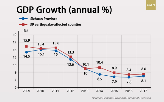 The 10 most seriously affected counties maintained rapid GDP growth, achieving a total GDP of 165.75 billion yuan (26 billion U.S. dollars) in 2017, 3.3 times more than in 2008. Their average annual growth rate was 13.1 percent, 2.1 percentage points higher than the provincial level.