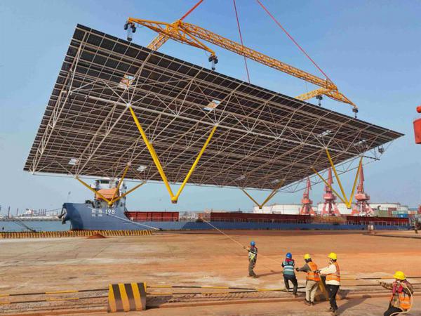 A crane lifts a large steel photovoltaic platform onto a ship in Laizhou, Shandong province, on Feb 27. TANG KE/FOR CHINA DAILY