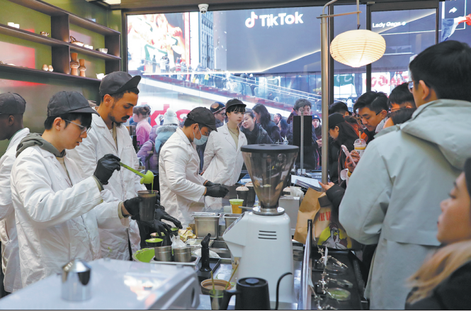 Customers line up at a Heytea store in Times Square, New York, on March 8, as they flock to the newly opened bubble tea brand from China. (LIAO PAN/CHINA NEWS SERVICE)
