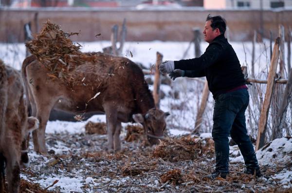 Musajan Khairat provides fodder to cattle in Xinyuan county of Ili Kazak autonomous prefecture, Northwest China's Xinjiang Uygur autonomous region, Feb 9, 2026. (Photo/Xinhua)