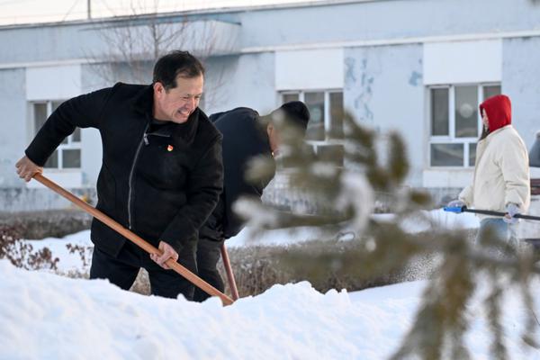 Musajan Khairat (front) cleans snow with local cadres near the community service center in Keregetas village, Xinyuan county of Ili Kazak autonomous prefecture, Northwest China's Xinjiang Uygur autonomous region, Feb 9, 2026. (Photo/Xinhua)
