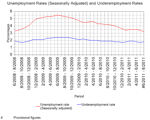 Hong Kong (CNS) -- The latest seasonal unemployment rate of the Hong Kong Special Administrative Region (SAR) has fallen to 3.2%, the lowest since February 1998, and the underemployment rate rose slightly to 1.8%, according to the Census and Statistics Department of the SAR government, September 20.