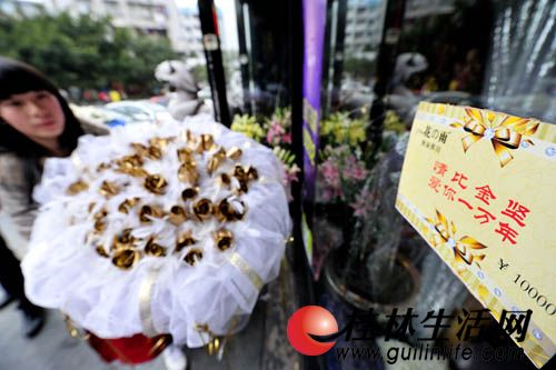 Guilin (CNS) -- A Valentine's Day bouquet of 52 "golden beauties," a new breed of rose that is painted gold, wrapped in white gauze, and embellished with white feathers, is priced at 10,000 yuan (about US$ 1,587.6) at a local flower shop in Guilin, southwest China's Guangxi Zhuang Autonomous Region.