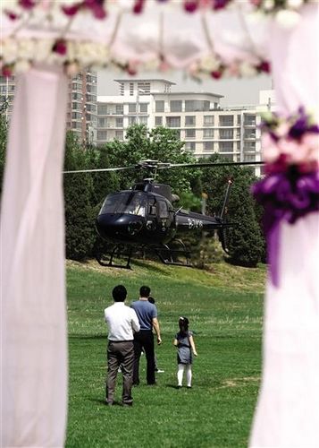 Beijing (CNS) -- A helicopter landed at a mission near the east fourth-ring road of Beijing to welcome a new bride on May 6 – this is the first customer of a new business service provided by a subsidiary of Beijing Capital Airline Company.