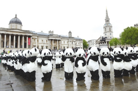 108名装扮成大熊猫模样的“熊猫人”,4日上午出现在伦敦市中心特拉法加广场,拉开了“熊猫保护意识周”活动的序幕。
