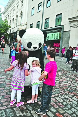 The "giant pandas," played by local actors, gave bear hugs to pedestrians in Covent Garden and China Town and on Charing Cross Road, among other London landmarks.