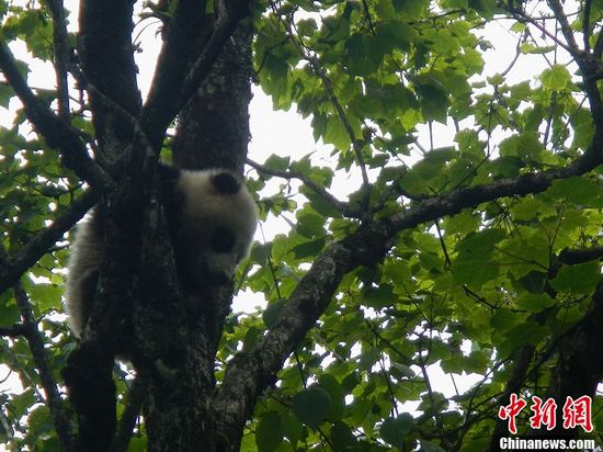 Chengdu (CNS) -- A field research team photographed a wild giant panda cub playing in a tree 3,000 meters above sea level at Wolong Nature Reserve, Sichuan Province on July 12. The image of this one-year-old giant panda was taken to the team's camp on July 16.
