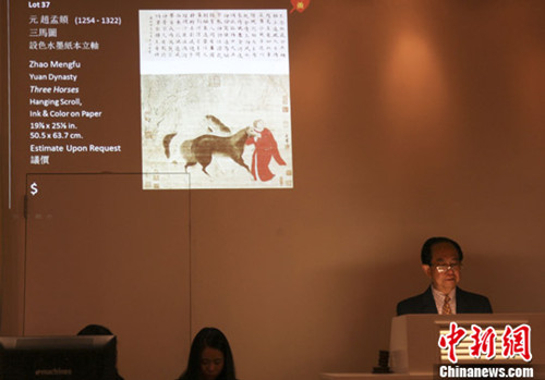 New York (CNS)-- A painting and a calligraphy work by Zhao Mengfu, a famous artist from the Yuan Dynasty (1271-1368), sold for 126 million yuan (US$20 million) at a Sunday auction in New York.