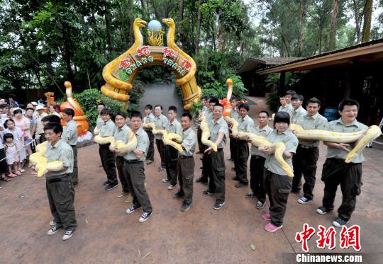 Guangzhou (CNS) -- Six Burmese pythons at Chimelong Safari Park in Guangzhou, Guangdong province, formed an eye-catching array on Sunday.
