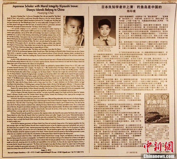 New York (CNS) -- Chen Huanjing, son of eccentric millionaire philanthropist Chen Guangbiao, placed an ad on New York Times Monday to claim Chinese sovereignty over Diaoyu Islands.