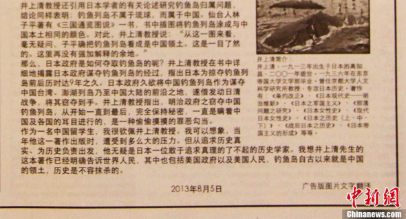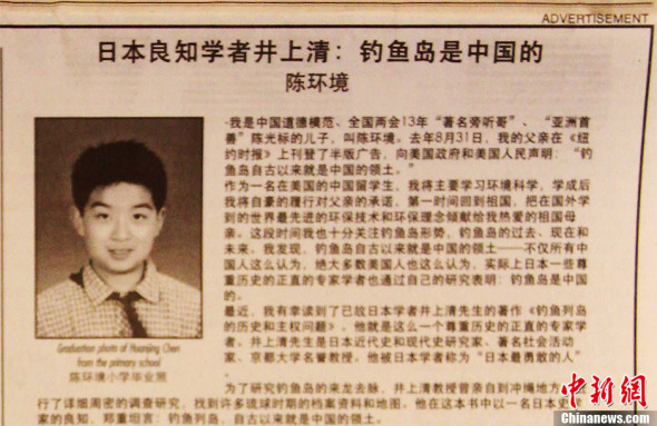 Son of Chinese tycoon places Diaoyu ad on New York Times(2)