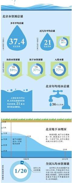 Beijing is home to 20 million residents. The annual supply of water resources is about 2.1 billion cubic meters, while the city's annual water usage stands at 3.6 billion cubic meters, which means the water supply gap in Beijing has reached 1.5 billion cubic meters, according to statistics released by the water authority.